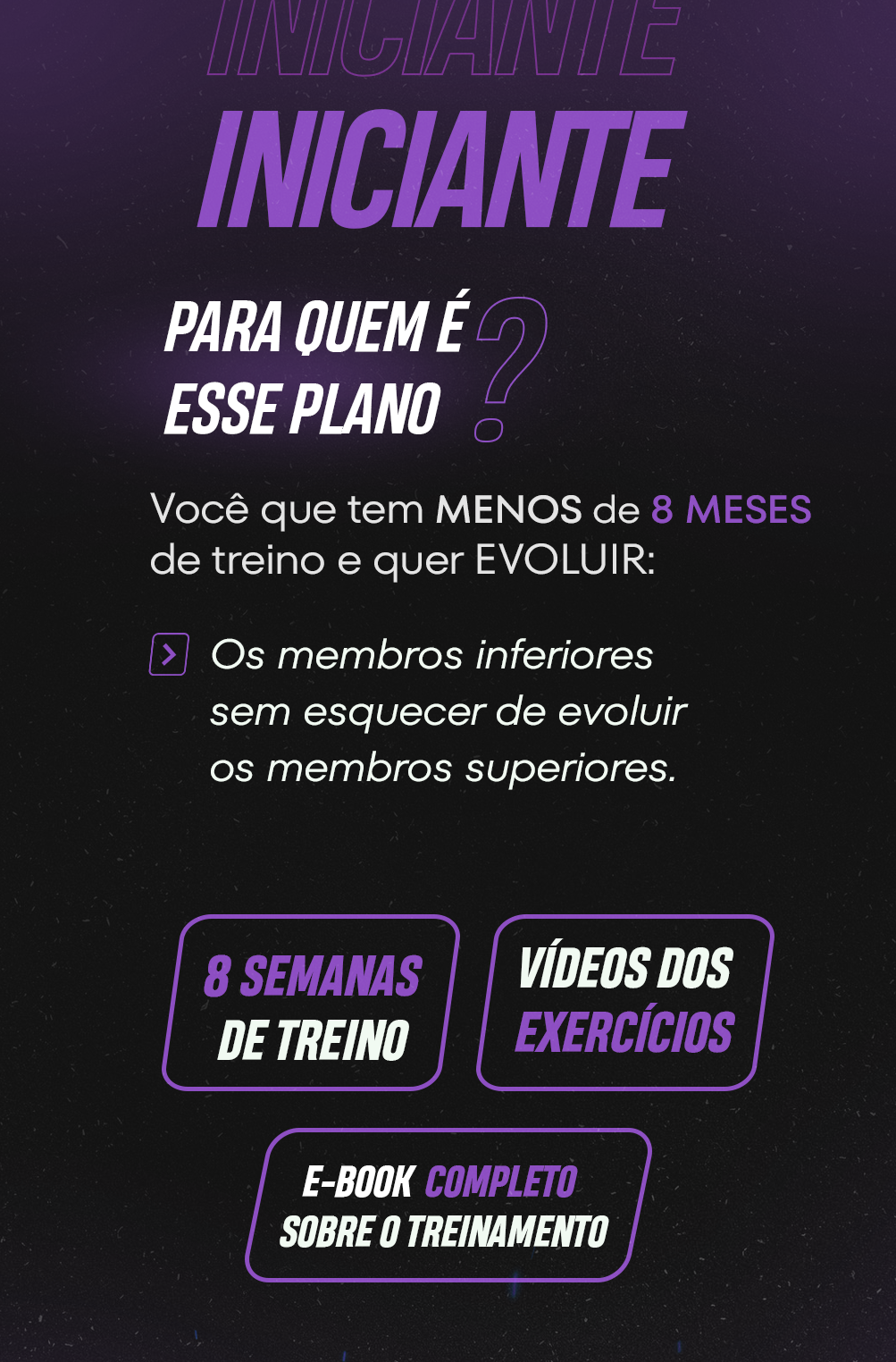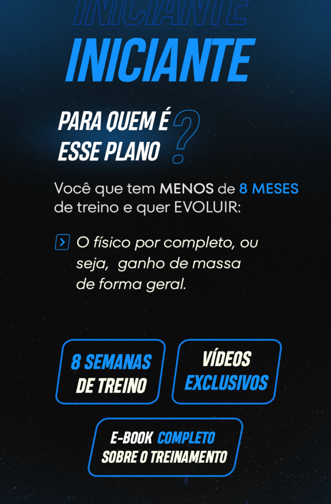Treino para avançados não funcionapara iniciantes.Por isso criei 4 planos, cada um de acordo com seu nível de treinamento e objetivo.